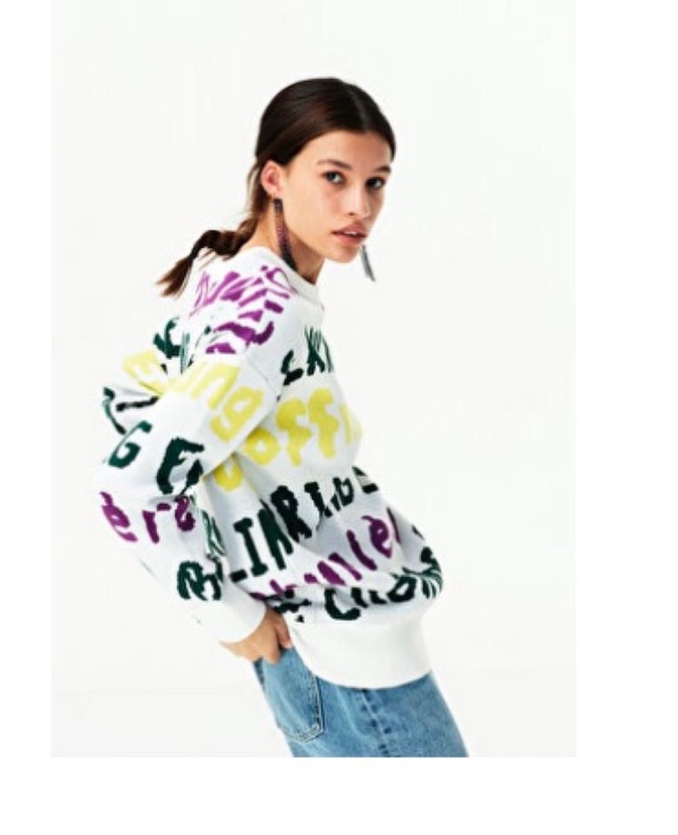 Rahat kesim, uzun kollu ve bisiklet yaka kadın sweatshirtü. Beyaz zemin üzerinde renkli graffiti tarzı yazılarla süslenmiş, yumuşak örme kumaştan.