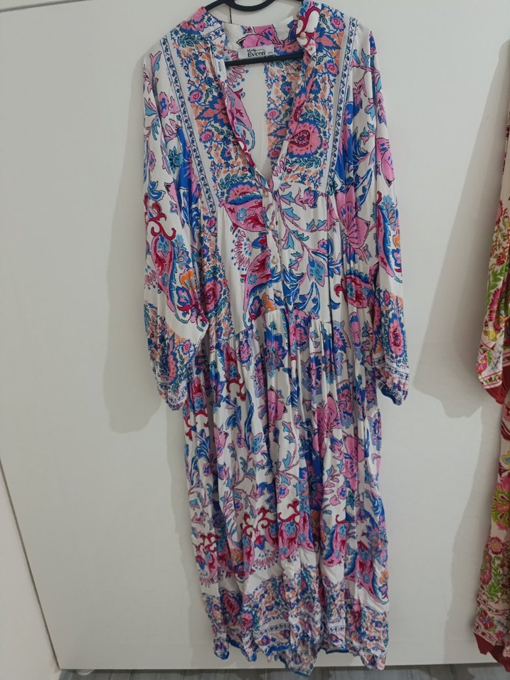 renkli yazlık uzun kol ve V yakalı, bol kesim bohem elbise. Pastel çok renkli desenlerle günlük kullanıma uygun.