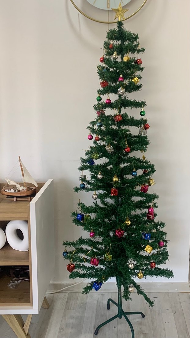 Çeşitli renklerde küçük hediye kutuları ve toplardan oluşan renkli yeni yıl ağacı süsleri ile birlikte ağaç (1.50 m) ve yaklaşık 5 metrelik renkli ışık