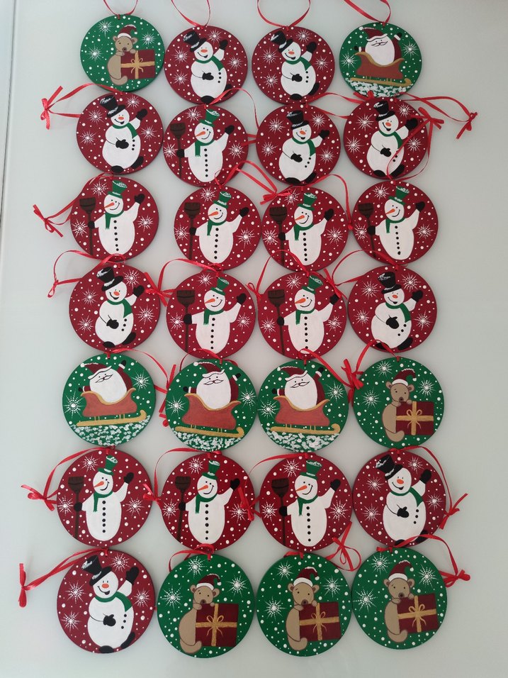 Kardan adam, Noel Baba ve geyik figürlü, asmak için kırmızı kurdeleli renkli yuvarlak yeni yıl süsleri seti. her biri 10 cm çapında 3 mm kalınlığında ham MDF üzerine akrilik boya ile çizilip boyandı ve verniklendi. yılbaşı ağacı süsü olarak 85 TL.bardak altlığı olarak adet fiyatı 75 TL dir.. tercih etmek isterseniz istediğiniz renk desen model çalışılabilir #bardakaltlığı #magnet #öğretmenlergünü #öğretmenlergünühediyesi