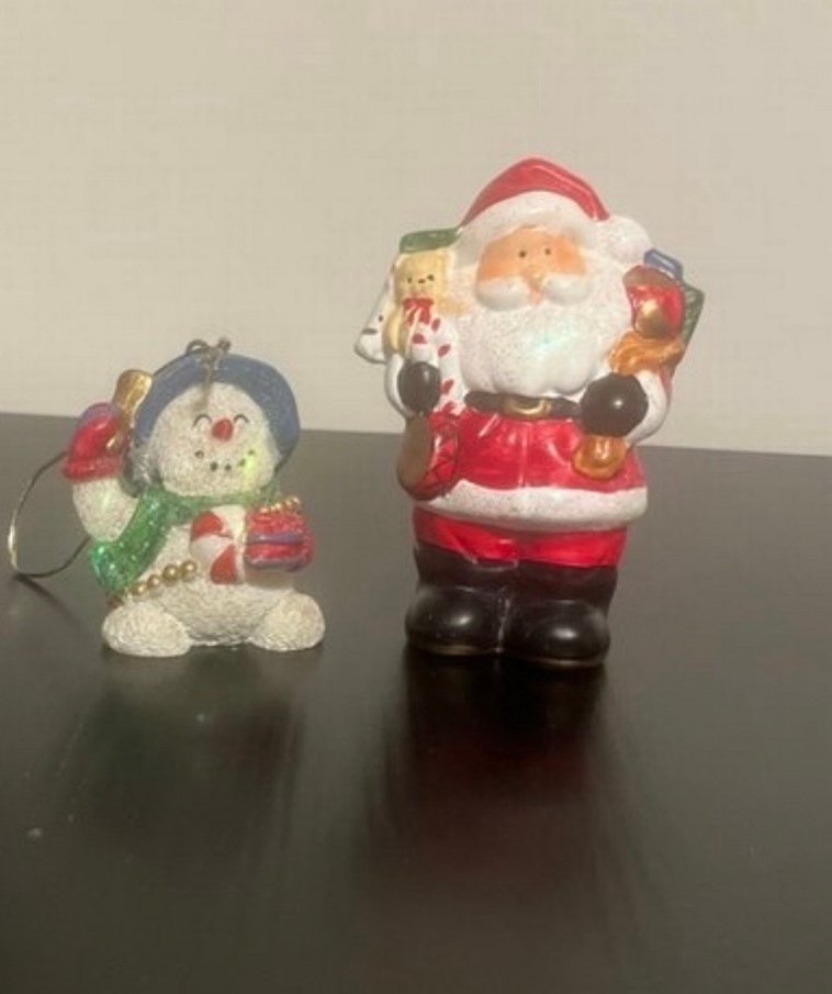 Kardan adam teneke kutu, küçük kardan adam süsü ve Noel Baba figüründen oluşan renkli Yeni Yıl süsleri seti. Set olarak 100tl.