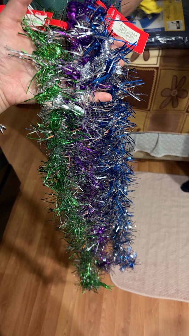 Yeşil, mor, mavi ve gümüş renkli parlak ipliklerden oluşan renkli yeni yıl süsü zinciri.