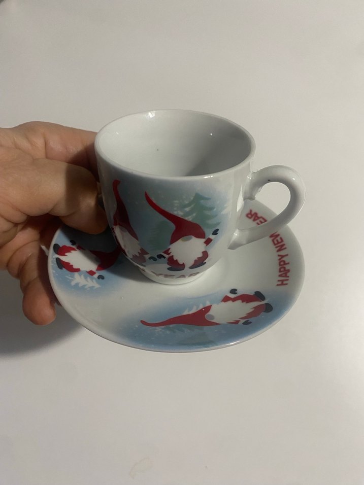 Beyaz fincan ve tabağı, renkli cüce figürleri ve 'Happy New Year' yazısıyla süslenmiştir, yılbaşı için uygundur . #Noel baba fincanı. #touchmeporselen