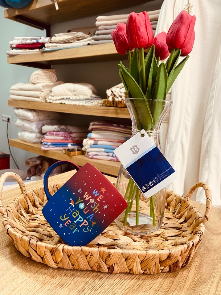 Kırmızı ve mavi tonlarda "We Wish You a Happy New Year" yazılı renkli kupa, yılbaşı kutlamaları için uygun.