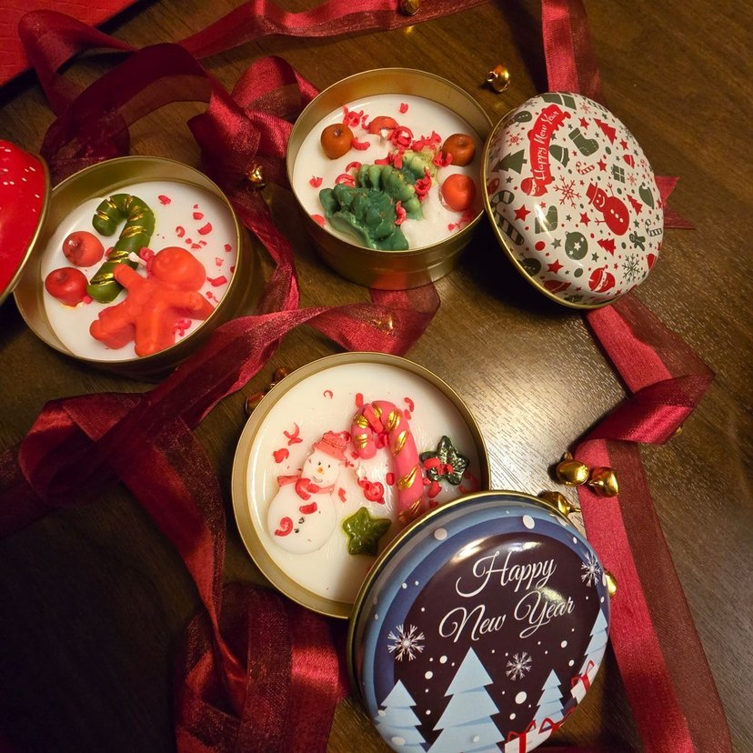 Yeni yıl süslemeli metal kutuda mum. Bir mumun fiyatıdır.