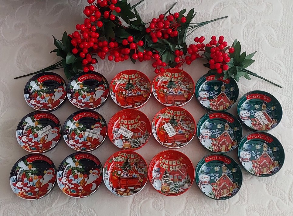 Sıfır Ürünler Renkli Yeni Yıl temalı küçük tabaklar, Noel Baba, kardan adam ve tatil sahneleri tasarımları içerir.