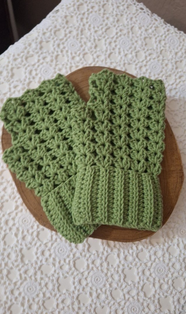 Renkli yeşil örgü eldivenler, rahat bohem tarzda, retro ve hippie görünüm için detaylı örme desene sahip.