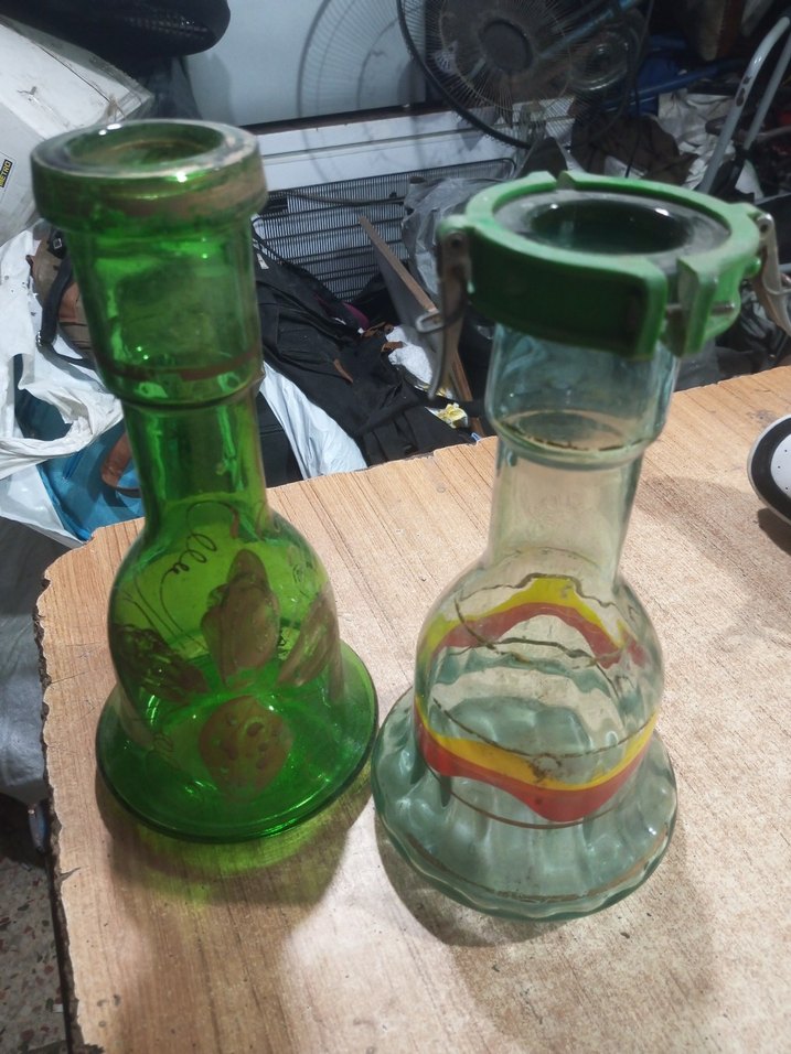 nargile camı İki farklı şekle ve süslemeye sahip renkli yeşil cam vazodan oluşan set. Biri kelepçeli kapaklı, diğeri yuvarlak tabanlı.