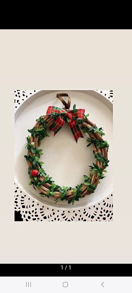 Renkli yeşil yapraklar ve dallardan oluşan, ekose fiyonk ve küçük uğur böceği süsü ile dekore edilmiş çelenk.