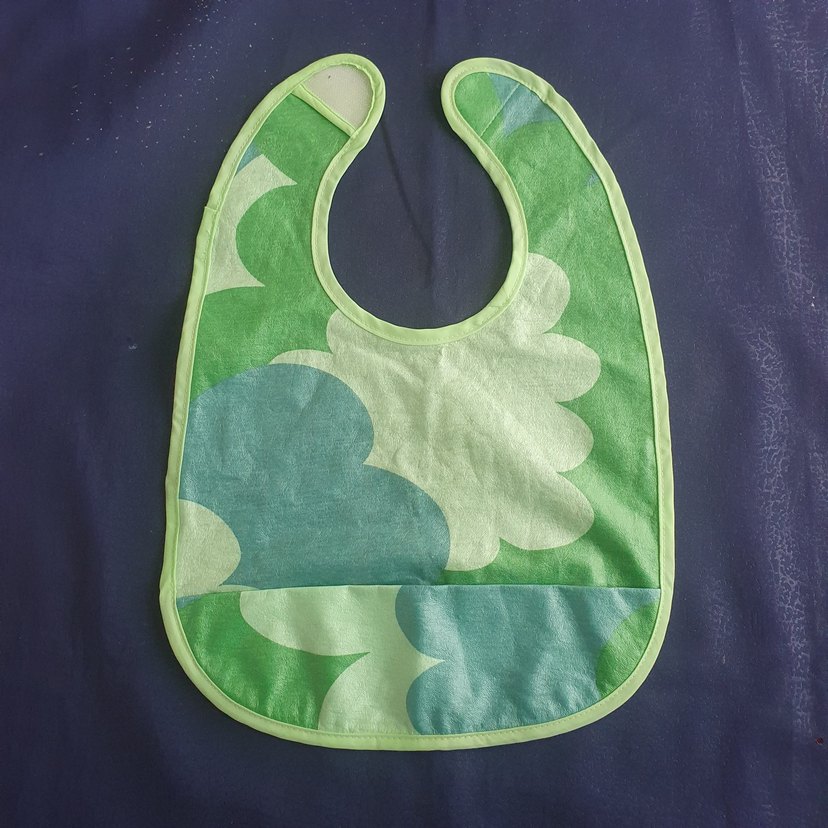 Yeşil ve mavi tonlarında renkli bağlamalı desenli bebek önlüğü. Yumuşak, emici kumaş ve alt kısmında cep bulunur.