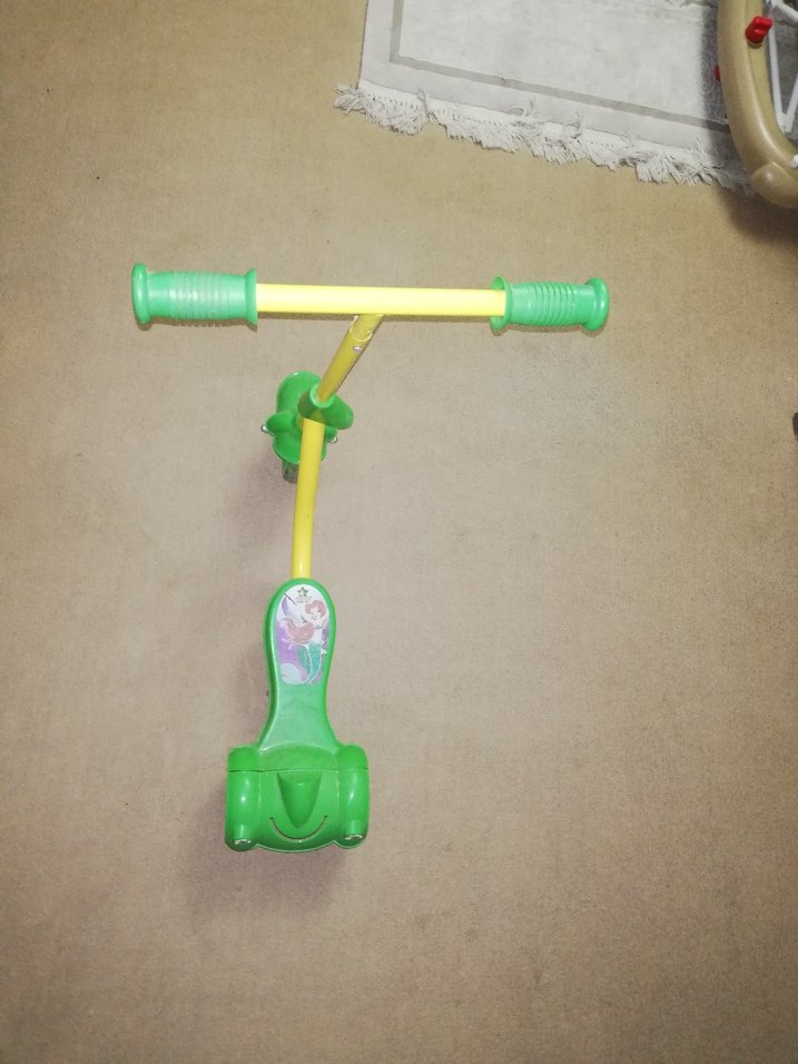 Renkli yeşil oturağı ve sapları, sarı gövdesiyle çocuklar için tasarlanmış scooter.