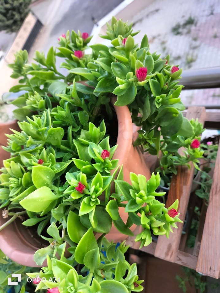Tek fide halinde son fotoğrafdaki saksidan tek dali köklü korunaklı bir şekilde gönderilecektir alana hayırlı olsun herkese keyifli alışverişler diliyorum #buzçiçeği #kazayağı #katırtırnağı #sukulent #kaktüs #alovera #borazançiçeği #ezançiçeği #meleklerinborazanı #mumçiçeği #damatpijaması yeşil yaprakları ve küçük pembe çiçekleri olan renkli bir ev bitkisi .