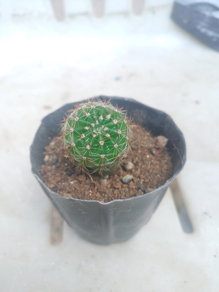 Toprak ve siyah saksı içinde ince dikenli küçük yeşil kaktüs. Her mekâna doğal bir dokunuş katar.