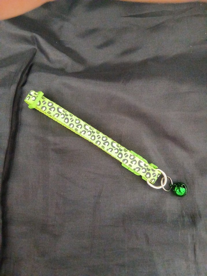 Leopar desenli renkli yeşil kedi tasması, küçük bir çan ile birlikte gelir. Ayarlanabilir ve hafiftir.