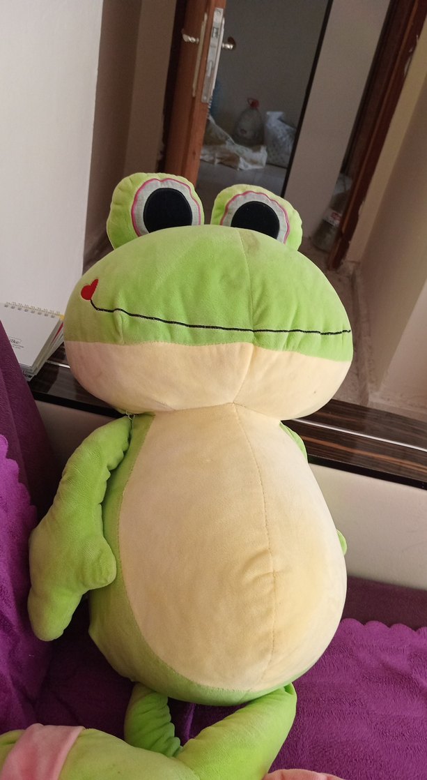 Büyük gözlü, gülen yüzlü yumuşak ve renkli kurbağa peluş oyuncak.