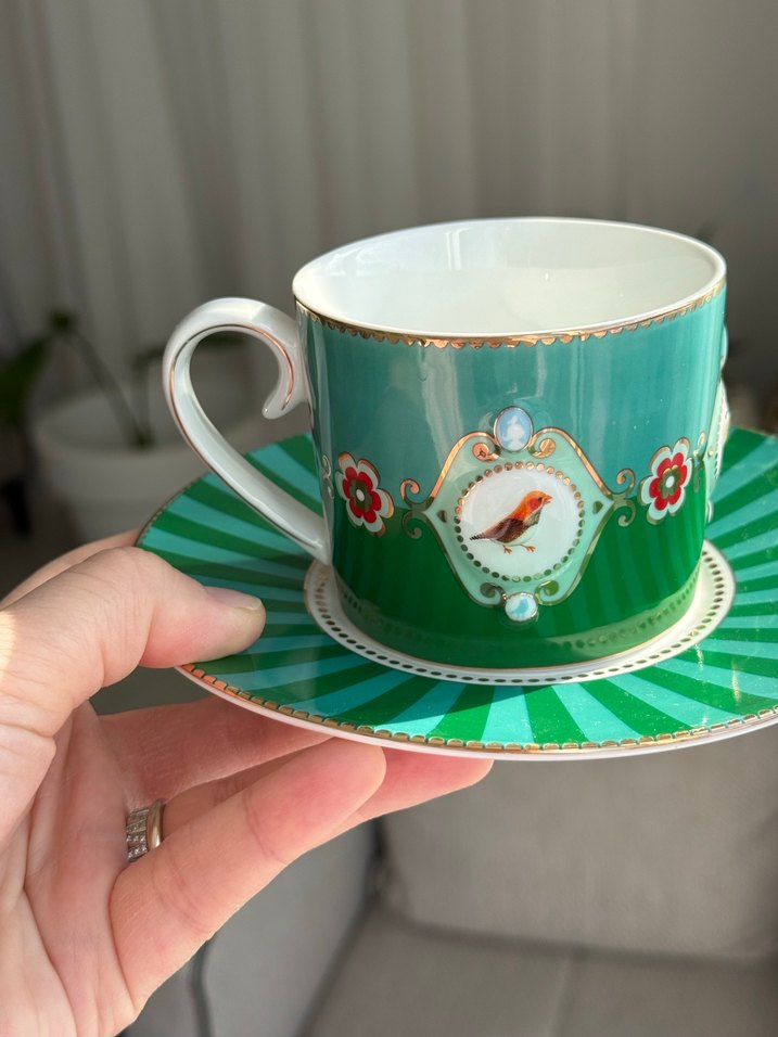 Kuş ve çiçek desenli, renkli yeşil fincan ve tabak seti. Kenarlarında altın detaylar bulunur. Çay veya kahve için uygundur.pip stüdyo çay fincanı .yeni bir adet