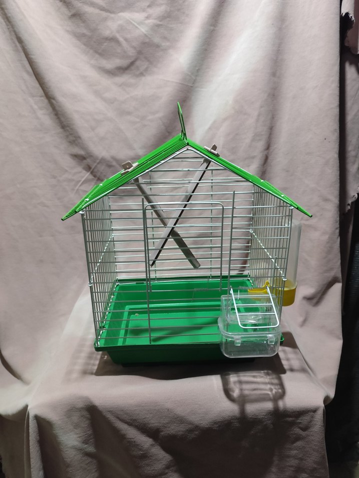 Eğimli çatılı, tüneklik, yemlik ve suluklu renkli yeşil kuş kafesi.