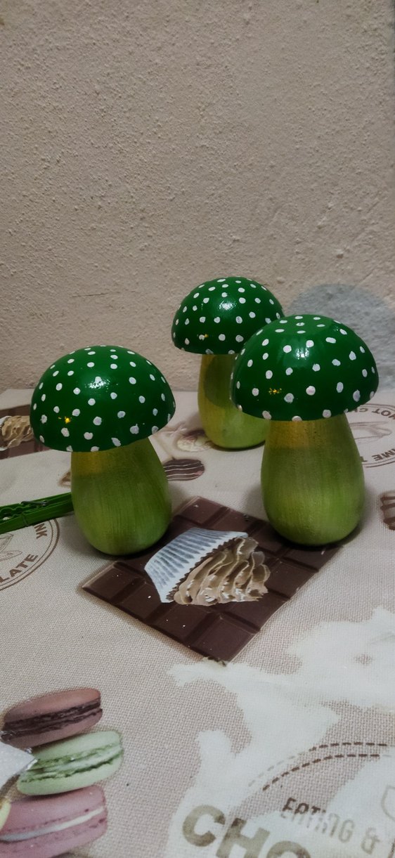 Beyaz benekli renkli yeşil mantar figürleri, dekoratif amaçlıdır. Sipariş alınır