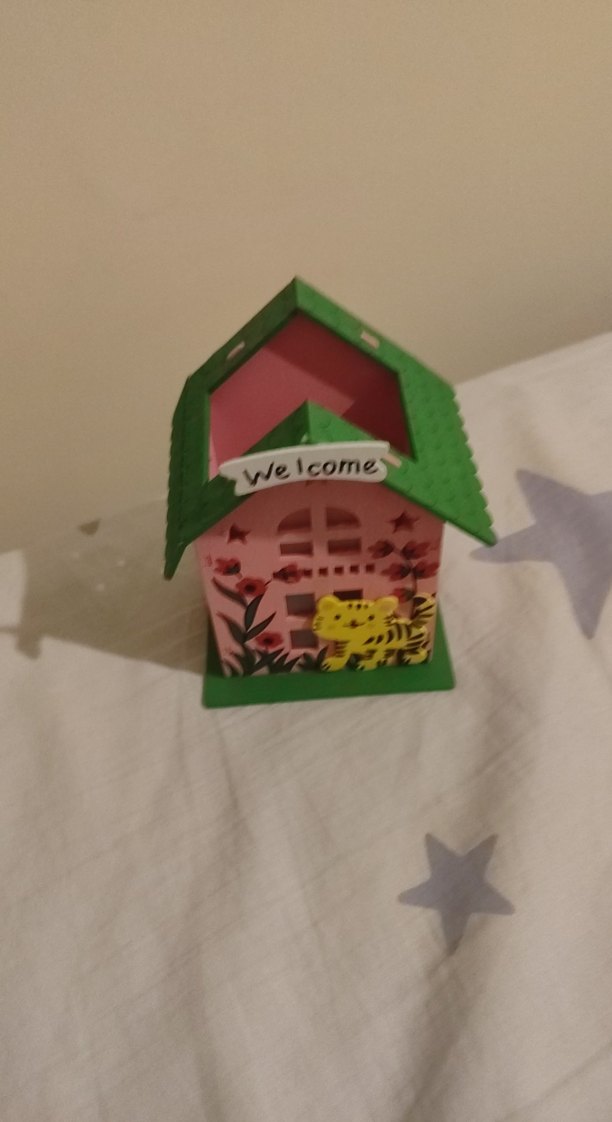 Renkli mini ev dekoru, yeşil çatılı ve üzerinde "Welcome" yazısı bulunan, küçük kaplan figürlü ve çiçek desenli.