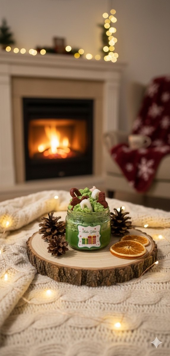 Renkli yeşil mum, dekoratif kavanozda ve ahşap tabakta, sıcak ortamlara uygun detaylarla süslenmiş. ️