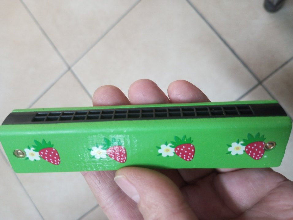 Çilek ve çiçek desenleriyle süslenmiş renkli yeşil müzik oyuncağı.