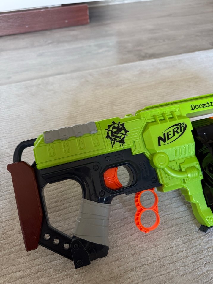 Renkli yeşil NERF Doom oyuncak tüfek, turuncu tetik detayları ve kahverengi dipçik ile dikkat çekiyor.