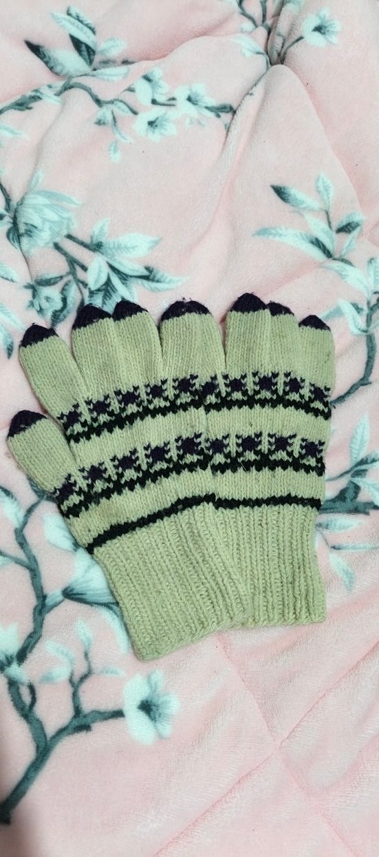Renkli yeşil örgü kadın eldiven, siyah desenli detaylarla bohem ve retro tarzı yansıtır.