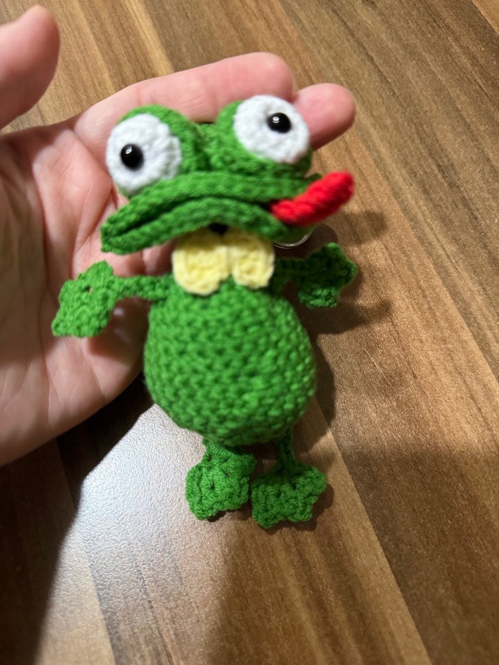 Büyük gözlü, kırmızı dili olan renkli yeşil örgü kurbağa anahtarlik yumuşak ve el yapımı.