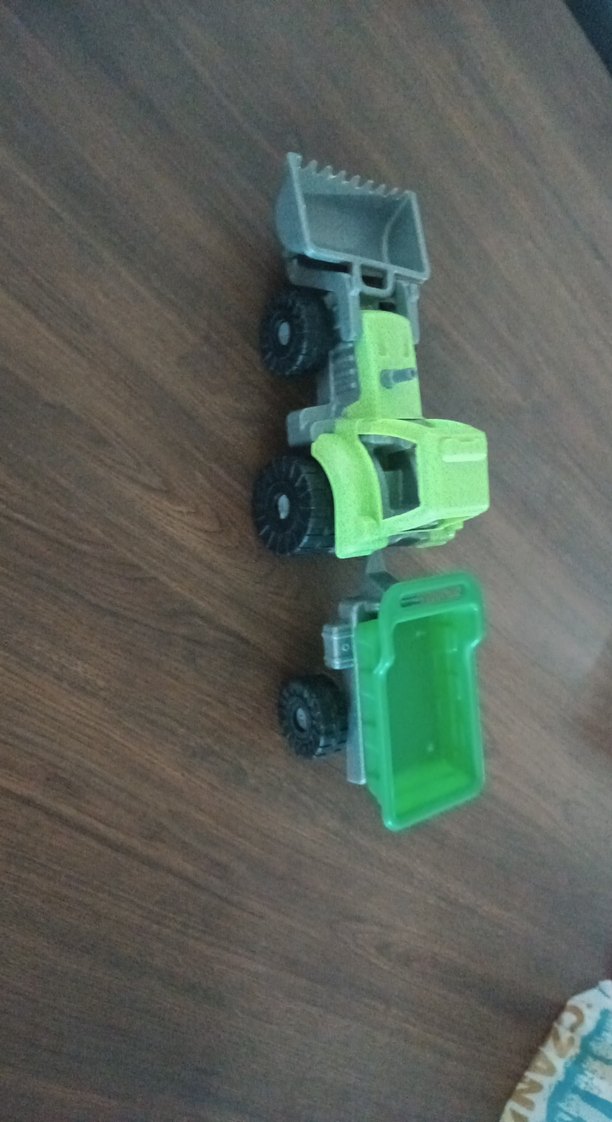 Hareketli parçaları ve siyah tekerlekleri olan renkli yeşil oyuncak kepçe.