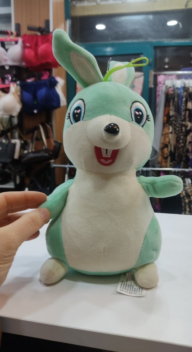Bu renkli peluş oyuncak, büyük ifadeli gözlere ve neşeli bir gülümsemeye sahip yumuşak yeşil bir tavşandır. Üstünde asmak için halka bulunur.