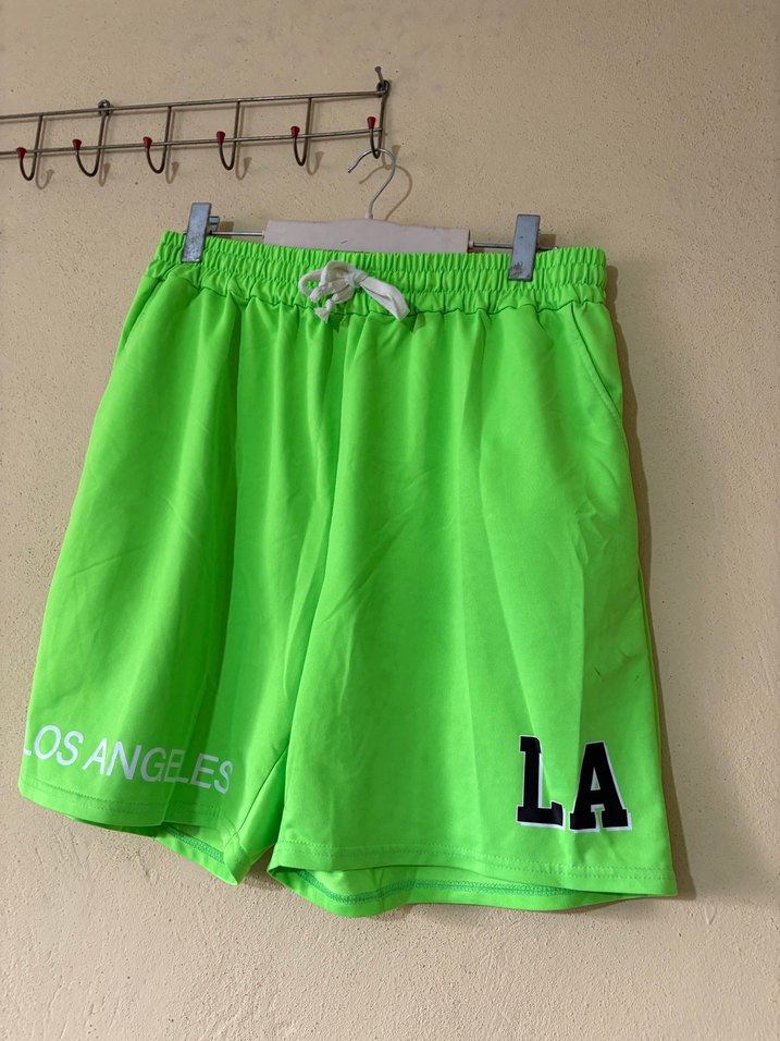 Rahat kesim, kısa boy erkek şortları canlı yeşil renkte, 'LA' ve 'LOS ANGELES' baskılı, sentetik kumaştan sportif rahatlık sağlar.