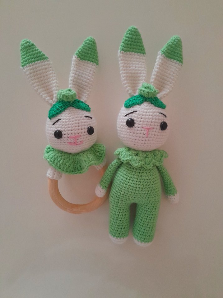 Renkli yeşil tavşan figürlü, ahşap halka ve yumuşak örme kumaştan yapılmış diş kaşıyıcı ve çıngırak. Bebekler için güvenlidir.