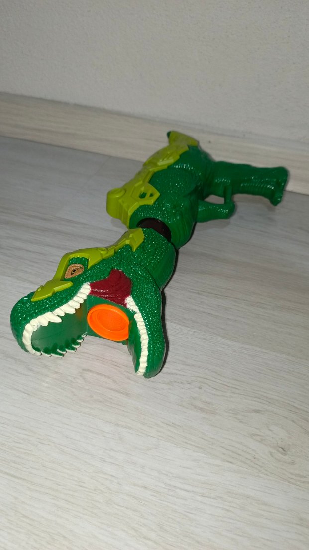 Renkli yeşil timsah figürlü oyuncak tabanca, detaylı dokusu ve canlı renkleriyle dikkat çekiyor.