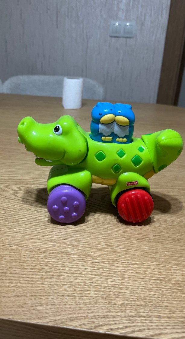 Üzerinde mavi kuş bulunan, tekerlekli renkli yeşil timsah oyuncak. Pürüzsüz plastikten yapılmıştır ve hareket ettirilebilir.