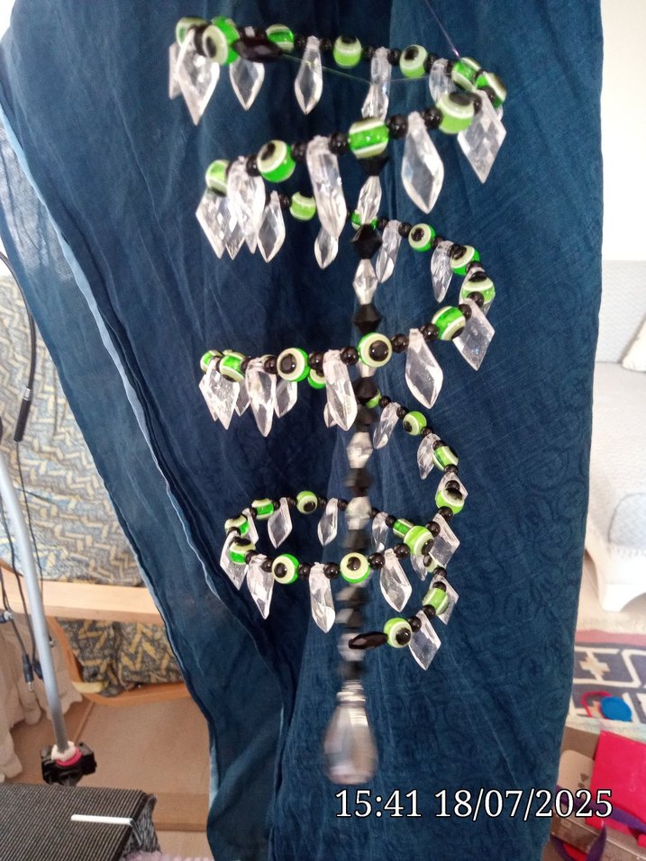 Boncuklarla süslenmiş, renkli yeşil yılan desenli Boncuklu rüzgar gülü balkon süsü