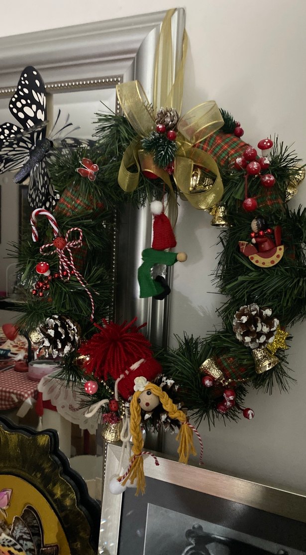Renkli kurdeleler, kozalaklar, kırmızı meyveler ve yılbaşı figürleriyle süslenmiş yeşil yılbaşı çelengi.