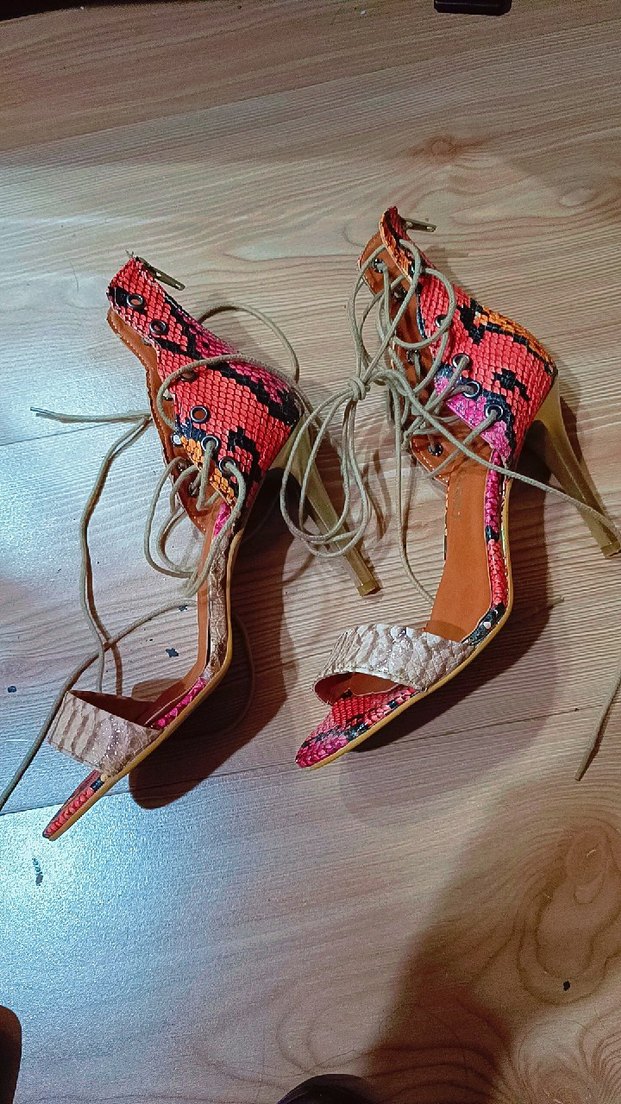 Sentetik kumaştan, renkli yılan desenli ve bağcıklı stiletto topuklu ayakkabılar. Romantik akşamlar için bohem tarzda.