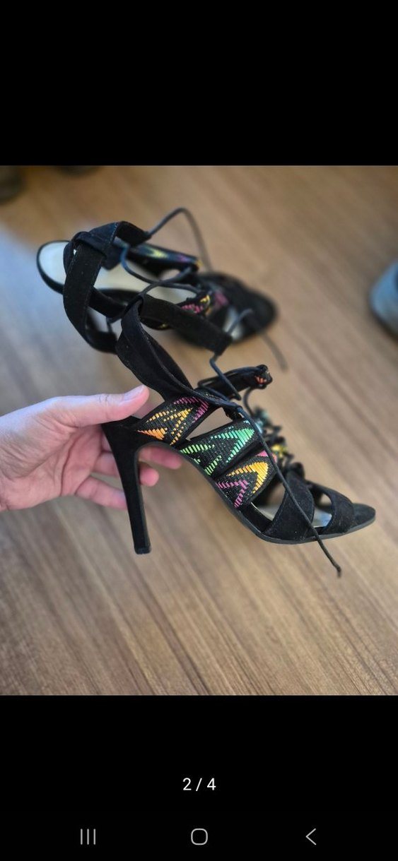 Renkli yılan desenli, bağcıklı bantlara sahip bohem ve avangart tarzda kadın topuklu ayakkabılar, romantik akşamlar için uygundur.