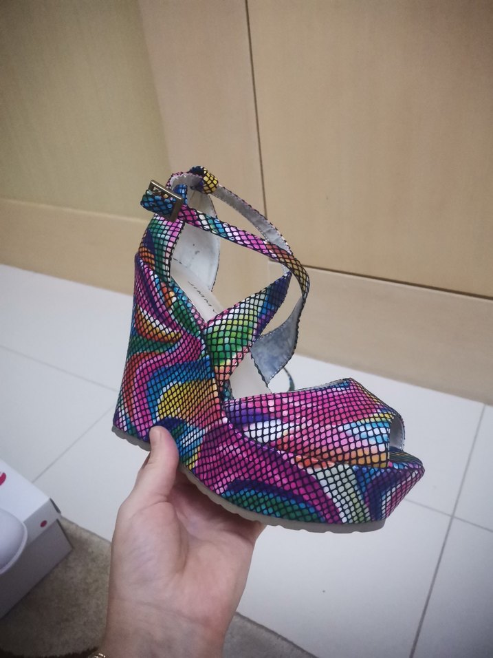 Renkli yılan desenli, tokalı kayışlı, kauçuk malzemeden yapılmış dolgu topuklu kadın ayakkabısı, çağdaş bir tarz sunar, parti için uygundur. Bodrumdan aldım sadece sahilde 1 kere giyildi