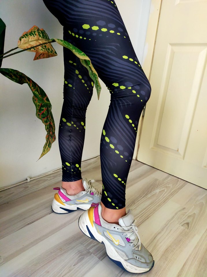 Renkli yılan desenli, elastik sentetik kumaştan yapılmış, kısa boylu, sıkı kesim spor tayt.