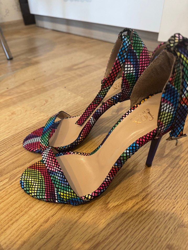 Renkli yılan desenli, tokalı ve kauçuk malzemeden yapılmış stiletto topuklu ayakkabılar. Romantik buluşmalar için uygundur.