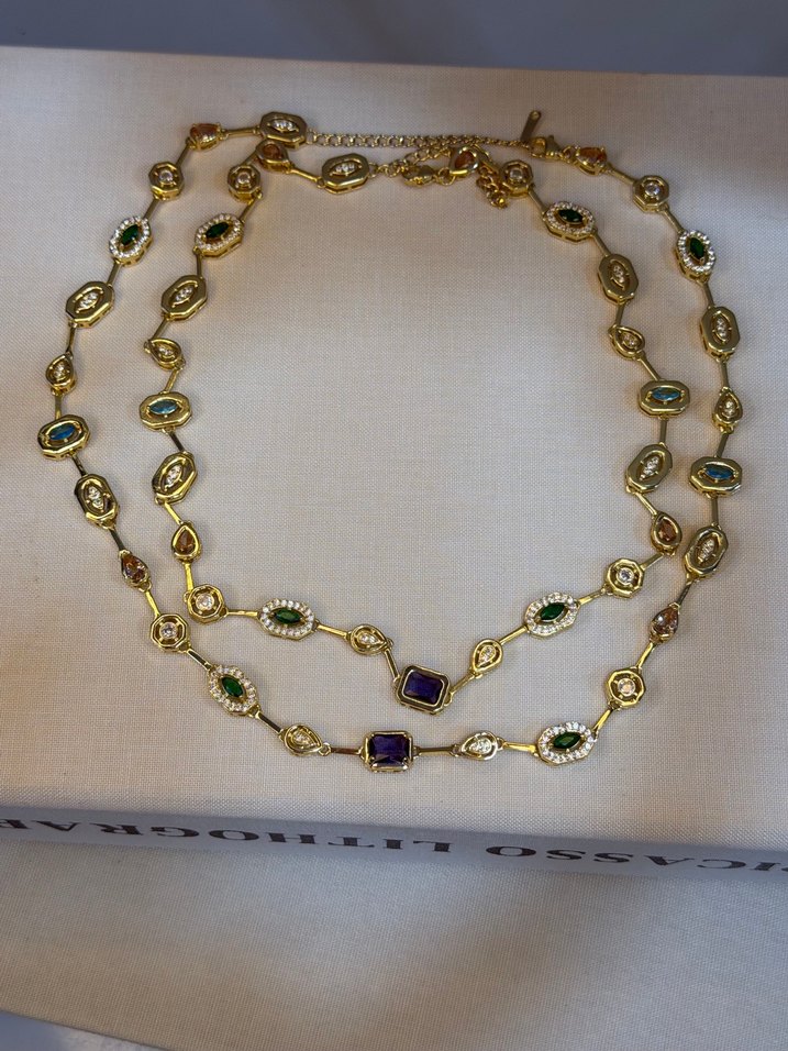 Renkli taşlar ve yılan desenli detaylara sahip uzun zincir kolye, bohem tarz için uygun.