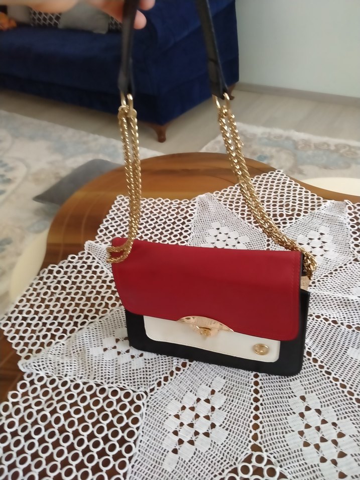 Renkli yılan desenli deri çanta, zincir detaylarıyla şık ve trend görünüme uygun. Çok renkli tasarımı ve kapaklı altın tonlu aksanlarıyla dikkat çeker.