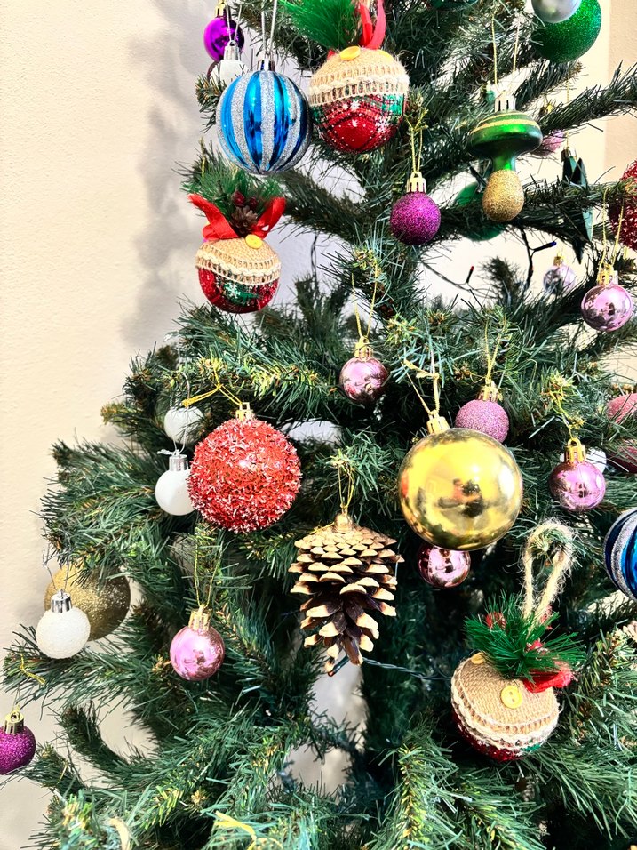 Renkli yılbaşı ağacı, farklı süslemelerle dekore edilmiştir; top, kozalak ve yıldızlar içerir, mekana şenlikli bir hava katar.
