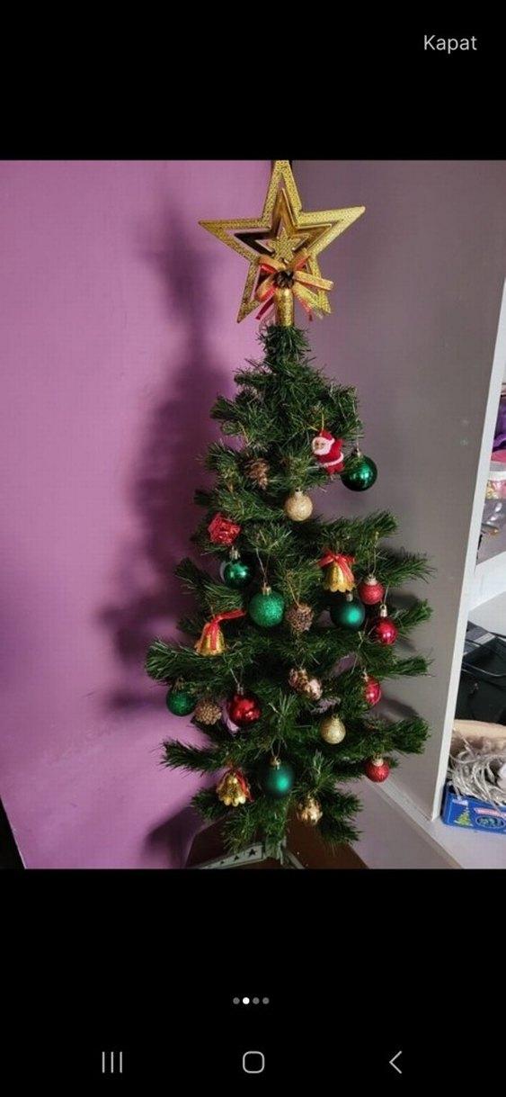 Çeşitli süslerle dekore edilmiş renkli yılbaşı ağacı. Top, çan ve yıldız süsleriyle şenlikli bir ortam yaratır.90 cm