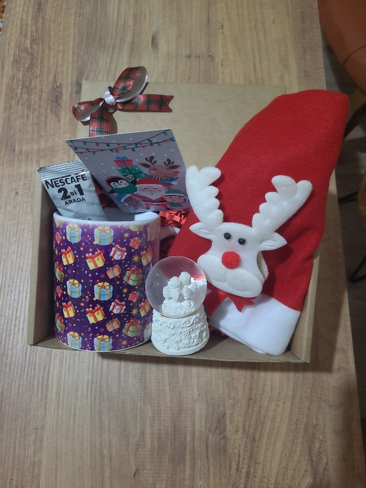 Renkli yılbaşı temalı kutuda geyik figürlü şapka, hediye desenli kupa, kar küresi, Nescafe kahve ve tebrik kartı bulunur .