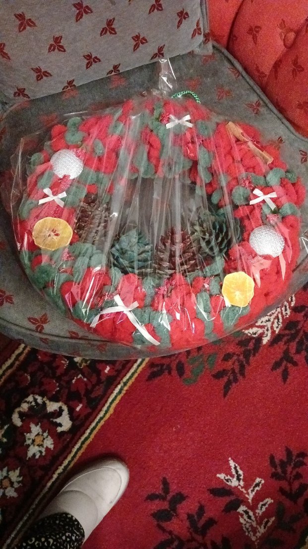 Kurutulmuş meyveler, çam kozalakları ve kurdelelerle süslenmiş renkli yılbaşı kapı çelengi, şeffaf plastikle kaplanmış.