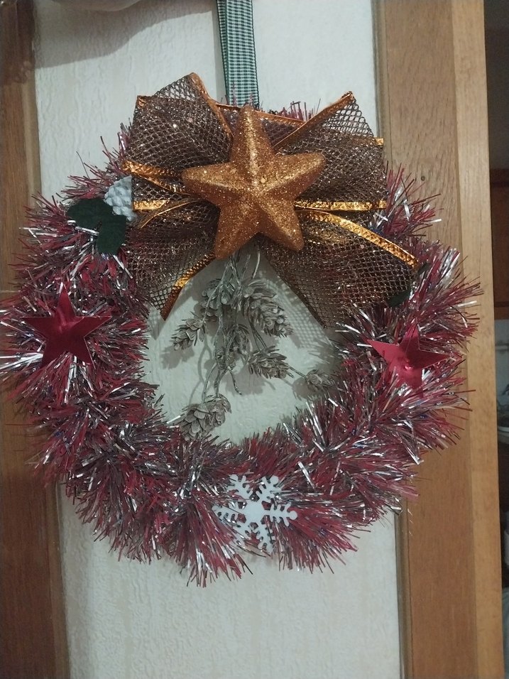 Renkli yılbaşı çelengi, kahverengi simli yıldız, kırmızı yıldızlar ve süslü fiyonk ile ev dekorasyonuna uygun.