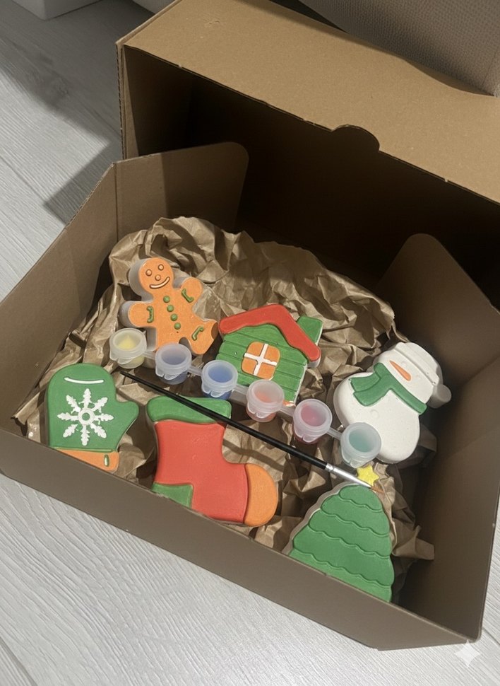 Zencefilli adam, kardan adam, çorap, eldiven, ev ve ağaç şeklinde renkli yılbaşı kurabiyeleri ile küçük boyama kutuları ve fırça içeren set. 6 renk boya 1 adet fırça içerir