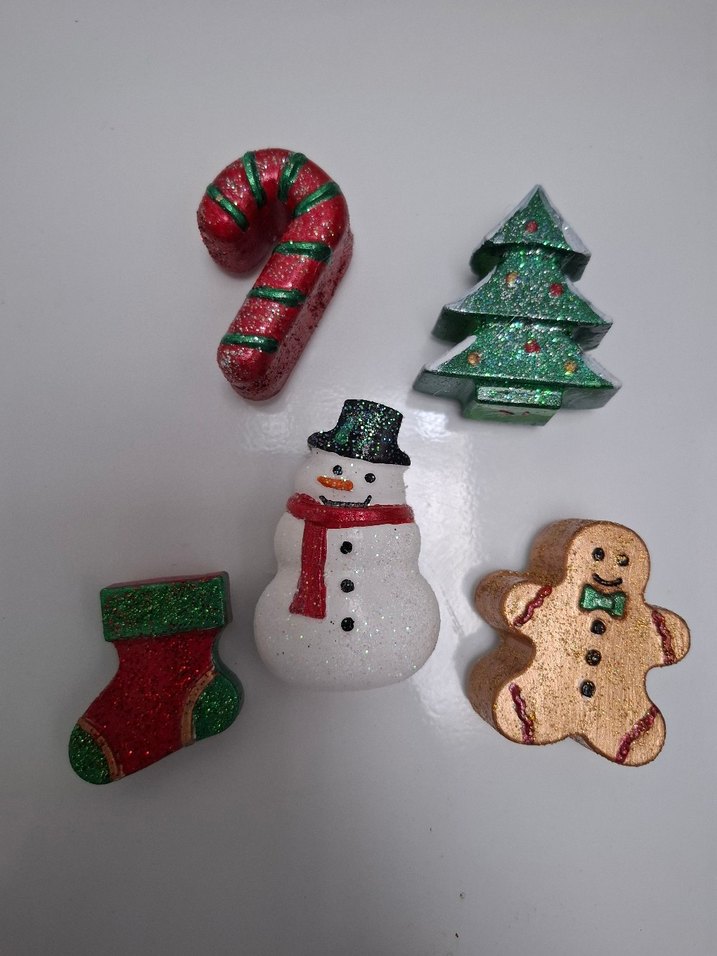 Parlak sim detaylı renkli yılbaşı magnet seti;baston şeker, çam ağacı, kardan adam, çorap ve zencefilli kurabiye figürleri.